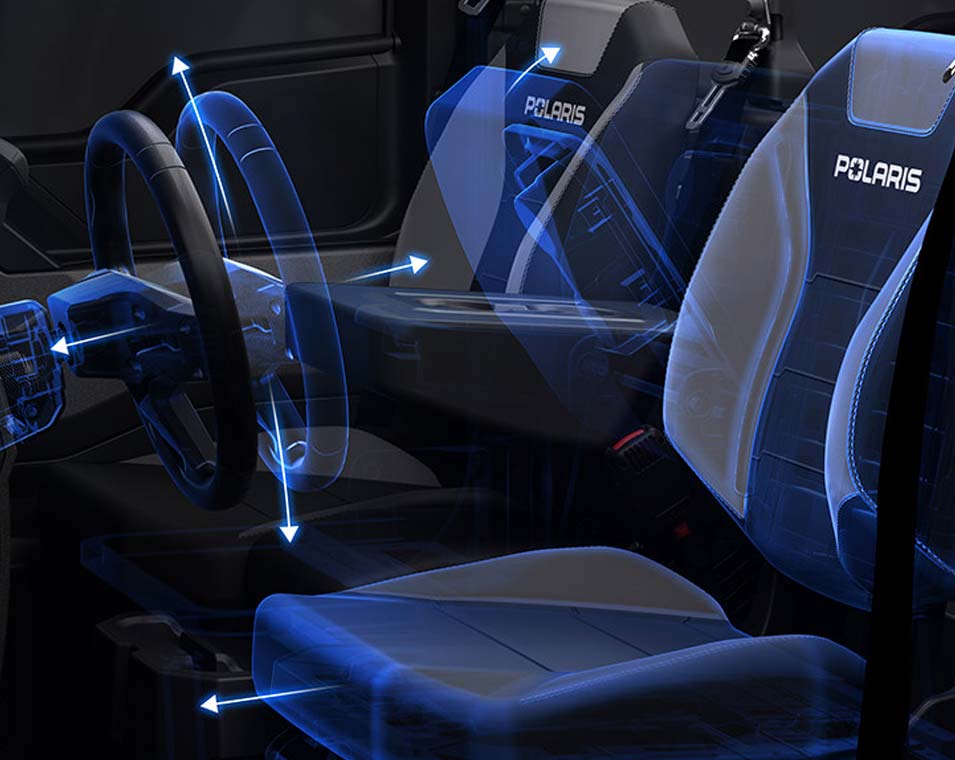 Premium Contoured Seats with Additional Bolstering and Center Armrests. Premium Steering Wheel and Interior Accents. Polaris Pulse Electrical System (6 position), 140 Amp Charging System, Roof with Liner, Front Bumper, DC Outlet, USB Charge Port, Trickle Charger, 12V Located in the Cargo Box with In-Dash On/Off Switch, NFC Front Badge