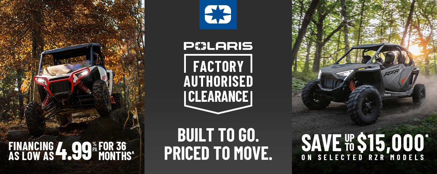 ^Information is valid as at 1 October 2025 and subject to change. 4.99% p.a. comparison rate (4.99% p.a. interest rate) is only available to private buyers approved by Pepper Asset Finance Pty Limited (PAF) for a 36 month fixed interest rate loan term with 20% deposit. Loan must be approved by 31 December and settled by 6 January 2026. Offer available for New or Demonstrator MY23-25 Ranger (Excludes Ranger 150), MY23-25 General, MY23-24 RZR (Excludes RZR 200) & MY24 Xpedition models only. While stocks last. Not available to ABN holders. Not available in conjunction with any other offer. Offers and promotions may be continued, withdrawn or changed at any time without notice. Extended delivery times may apply. Applications for credit are subject to loan assessment and eligibility criteria and lending limits. Terms, conditions, fees and charges apply. Information provided is factual information only and is not intended to imply any recommendation about any financial product(s) or constitute tax advice. If you require financial or tax advice you should consult a licensed financial or tax adviser. Credit is provided by Pepper Asset Finance Pty Ltd ABN 56 165 183 317 Australian credit license 458899.
